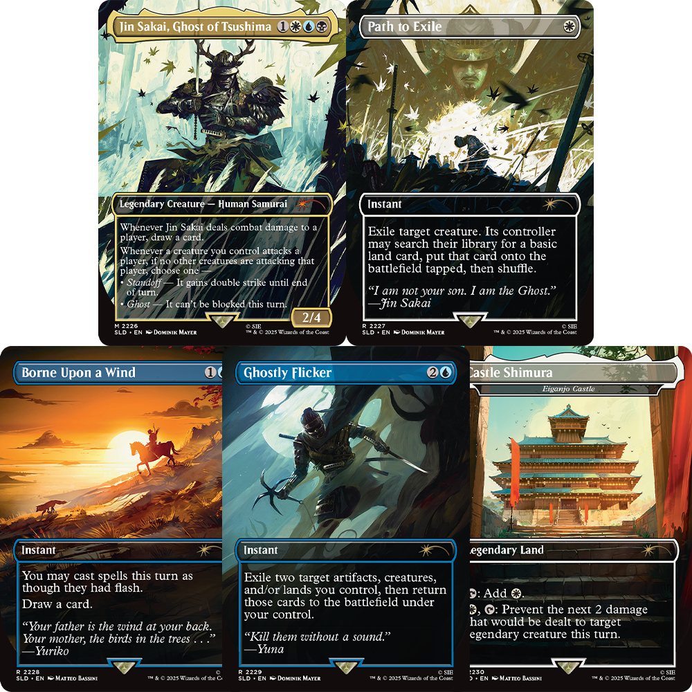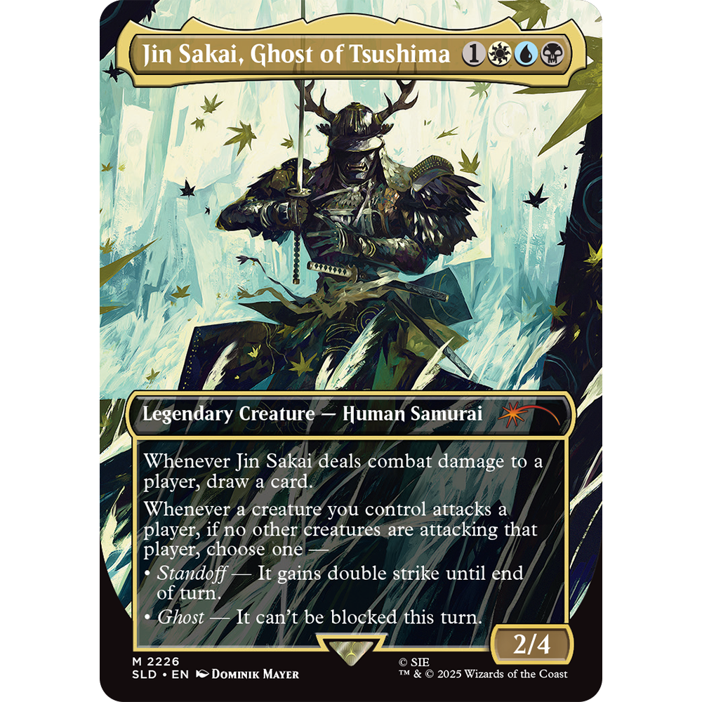The story of Jin Sakai’s journey to become the Ghost of Tsushima struck a chord with fans in 2020. His journey was one of self-discovery, tragedy, and redemption. As fans prepare for the upcoming, highly anticipated Ghost of Yotei, Secret Lair is proud to bring the characters and concepts of Ghost of Tsushima to Magic: The Gathering in this drop.