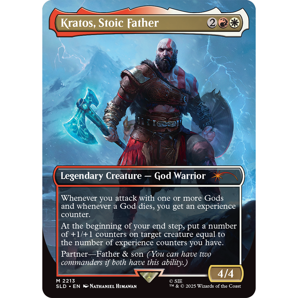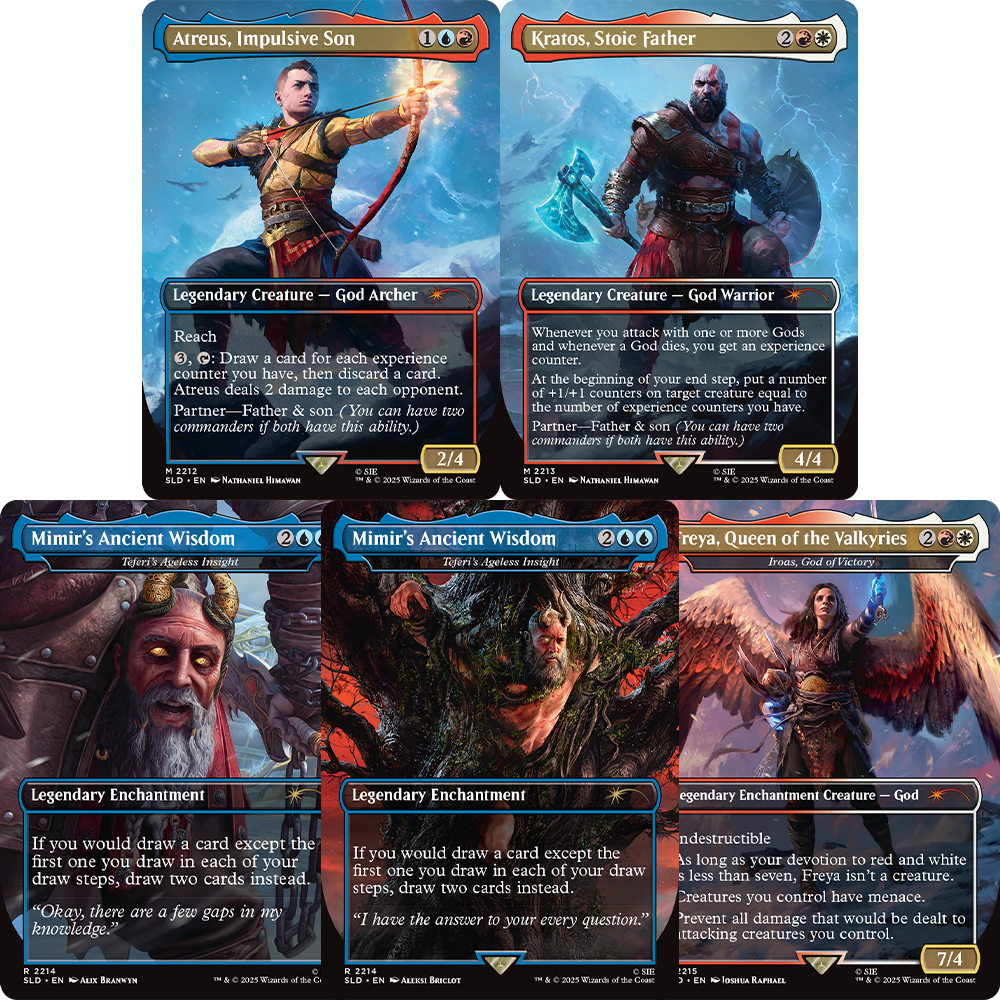 After carving a path of vengeance through Mt. Olympus, Kratos wandered for many years—eventually making his way to the mysterious Norse lands. Following the death of his wife, Kratos and his young son, Atreus, embark on a journey to honor her final wishes, entangling them with the Aesir gods and leading them on a path to eventually face the cataclysmic event of Ragnarök. Empower the father and son duo on the battlefield through Teferi’s Ageless Insight as Mimir (the reversible treatment allows you to play either Mimir-in-a-tree or Mimir-as-a-head) and Iroas, God of Victory given form as the indomitable warrior, and “Freya, Queen of the Valkyries.”